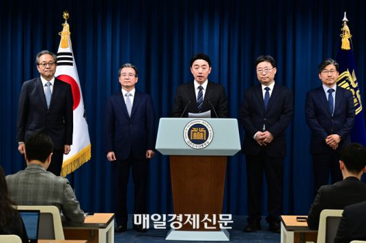 강훈식 대통령 비서실장이 6일 서울 용산 대통령실 청사에서 대통령실 수석비서관 인선을 발표하고 있다. (왼쪽부터) 문진영 사회수석, 김용범 정책실장, 강 비서실장, 하준경 경제성장수석, 류덕현 재정기획보좌관. 2025.06.06. [이승환 기자] |