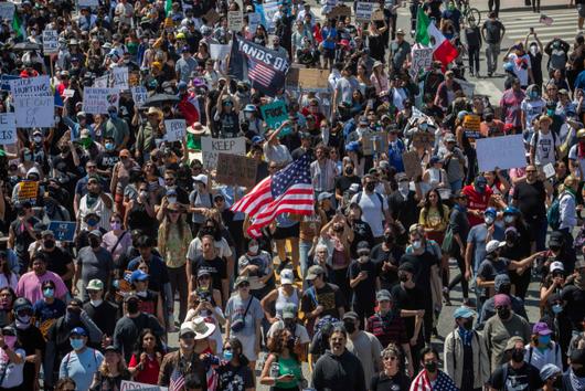 ▲8일(현지시간) 미국 캘리포니아주 로스앤젤레스에서 도널드 트럼프 정부의 이민 단속에 항의하는 시위대가 로스앤젤레스 시청에서 이 지역 연방 청사까지 행진하고 있다. ⓒAFP=연합뉴스 |