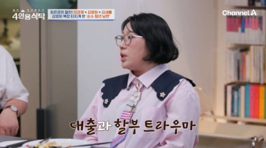 코미디언 김영희가 세상 물정 모르는 10살 연하 남편 윤승열 때문에 대출과 할부에 학을 뗐다고 고백했다./사진=채널A '절친 토큐멘터리 4인용 식탁' 방송 화면 |