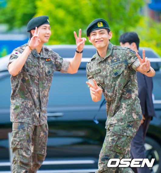 RM과 뷔는 10일 오전 1년 6개월 간의 복무를 마치고 만기 전역했다. RM과 뷔는 지난 2023년 12월 육군 현역으로 입대해 각각 육군 제15보병사단에서 군악대와 육군 제2군단 제802군사경찰단에서 복무를 마쳤다.