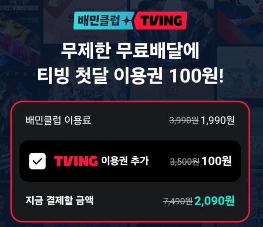 이 상품은 배달의민족이 무제한 무료배달·알뜰배달을 제공하는 배민클럽(월 3990원)과 티빙의 광고형 스탠다드 구독권(월 5500원)을 결합한 것이다. 구독료는 월 7490원이다. 배민클럽과 티빙에 각기 가입할 경우 월 9490원을 내야 하는데, 이 상품을 선택하면 2000원 저렴하다. 현재 판촉 행사까지 진행 중이라 실 결제 금액이 더 낮아지면서 가입자가 몰렸다.