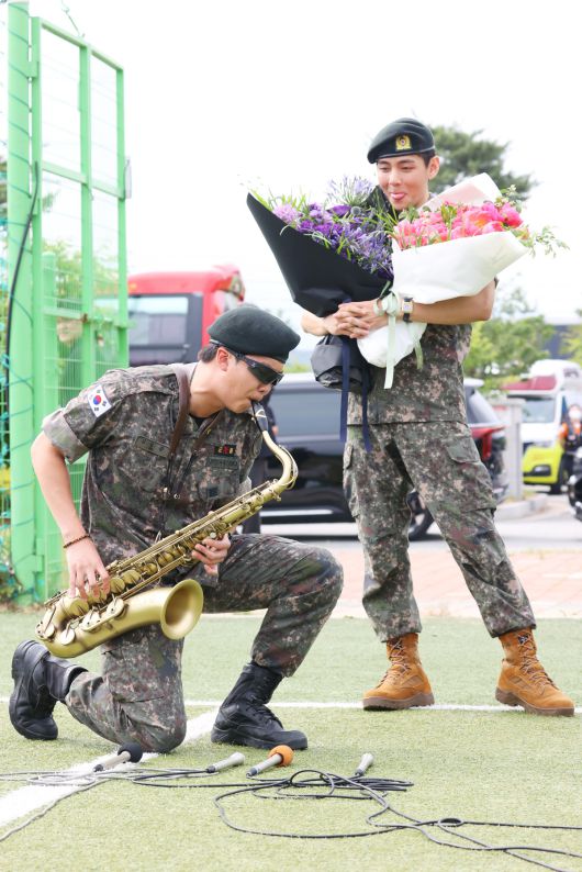함께 입대해 나란히 전역한 RM, 뷔는 유쾌한 모습으로 인사를 전했다. 특히 RM은 색소폰으로 애니메이션 '명탐정 코난'의 OST를 열정적으로 연주하며 등장, 현장을 웃음바다로 만들었다. 뷔도 커다란 꽃다발을 들고 밝은 미소를 지었다.