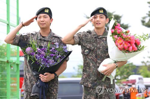 (춘천·서울=연합뉴스) 양지웅 강태현 이태수 기자 = 그룹 방탄소년단(BTS)의 RM(본명 김남준·31)과 뷔(본명 김태형·30)가 현역 군 복무를 마치고 10일 사회로 복귀했다.
