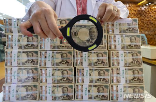 [서울=뉴시스] 김근수 기자 = 일본 여당이 고물가 대응책으로 전 국민에 현금을 지급하는 방안을 검토하고 있다. 사진은 지난해 7월30일 서울 중구 하나은행 위변조센터에서 직원이 엔화와 달러를 들어보이는 모습. 2024.07.30. ks@newsis.com |