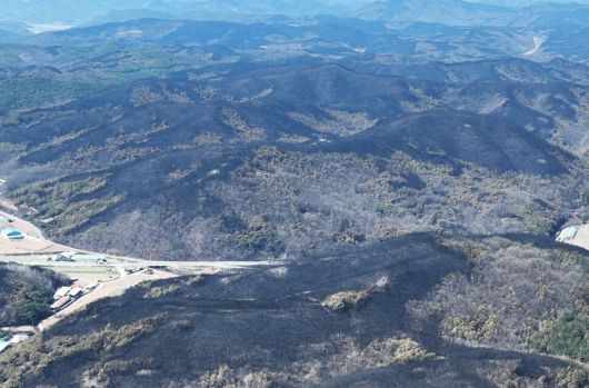 지난 3월 발생한 영남 산불은 대한민국 역사상 최악의 산림, 재산, 인명 피해를 낳았다. 산불 피해로 까맣게 탄 산의 모습. 사진 기후위기기록단 |