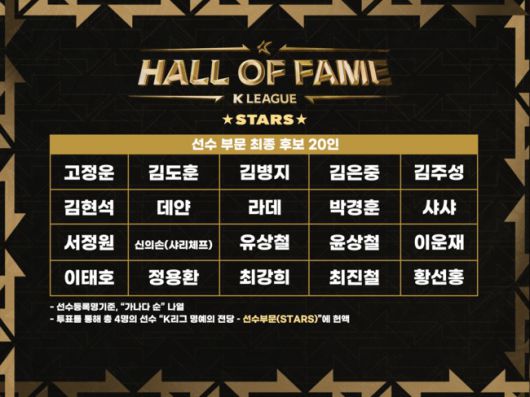 'K리그 명예의 전당'은 '선수(STARS)', '지도자(LEADERS)', '공헌자(HONORS)' 3개 부문으로 구성되며, 2023년을 시작으로 2년마다 헌액자를 선정한다. 올해 선수 부문은 K리그 역대 최고의 선수 4명을 선정하여 헌액할 예정이다.