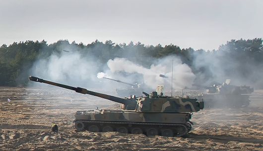 한화에어로스페이스가 수출한 K9 자주포가 폴란드 토룬 포병사격장에서 표적을 향해 포탄을 발사하고 있다. /국방부 제공 |