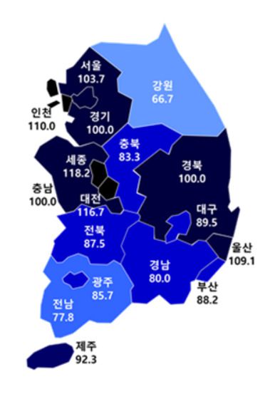 반면 ▲충북 16.7p(100.0→83.3), 강원 13.3p(80.0→66.7), 경남 12.9p(92.9→80.0), 전북 12.5p(100.0→87.5), 충남 7.7p(107.7→100.0), 부산은 1.3p(89.5→88.2) 하락 전망됐다.