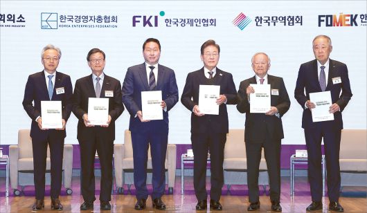 이재명 대통령이 대선 후보 시절인 지난달 8일 서울 중구 대한상공회의소에서 열린 경제5단체 간담회에서 정책 제언집을 전달 받은 후 기념촬영을 하고 있는 모습 왼쪽부터 최진식 한국중견기업연합회장, 윤진식 한국무역협회장, 최태원 대한상공회의소 회장, 이 대통령, 손경식 한국경영자총협회장, 류진 한국경제인협회장 [국회사진기자단] |