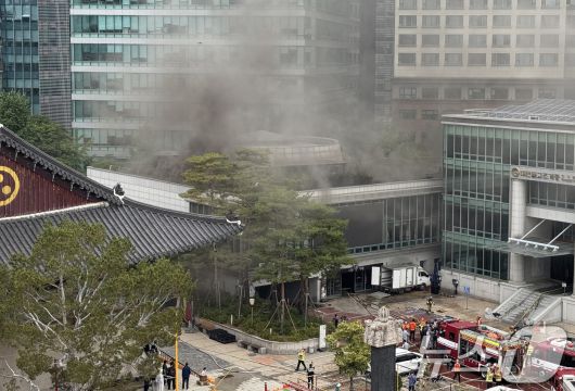 10일 오전 서울 종로구 조계사 옆 불교중앙박물관에서 화재가 발생해 소방관들이 진화작업을 펼치고 있다. 2025.6.10/뉴스1 ⓒ News1 김명섭 기자 |