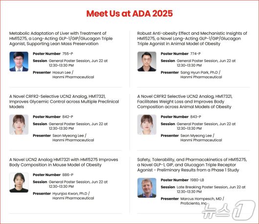 이번 ADA 2025에는 한미약품 R&D센터 연구원들이 대거 참석해 포스터를 발표하고, 한미의 새로운 치료 패러다임을 제시하는 비만 신약들을 소개할 예정이다. 유수의 글로벌 제약사들과의 발전적인 협력 기회를 모색할 방침이다.