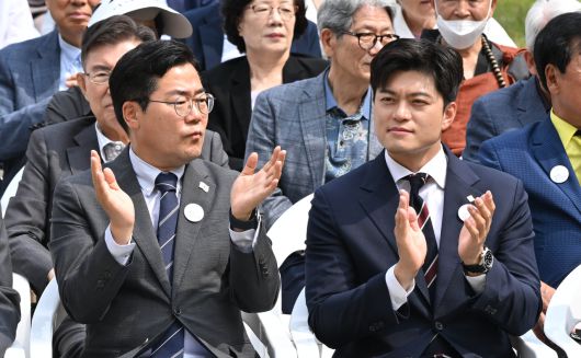 박찬대(왼쪽) 더불어민주당 대표 권한대항 겸 원내대표와 김용태 국민의힘 비상대책위원장이 10일 오전 서울 용산구 민주화운동기념관에서 열린 제38주년 6.10 민주항쟁 기념식 및 민주화운동기념관 개관식에 참석하고 있다. 임세준 기자 |