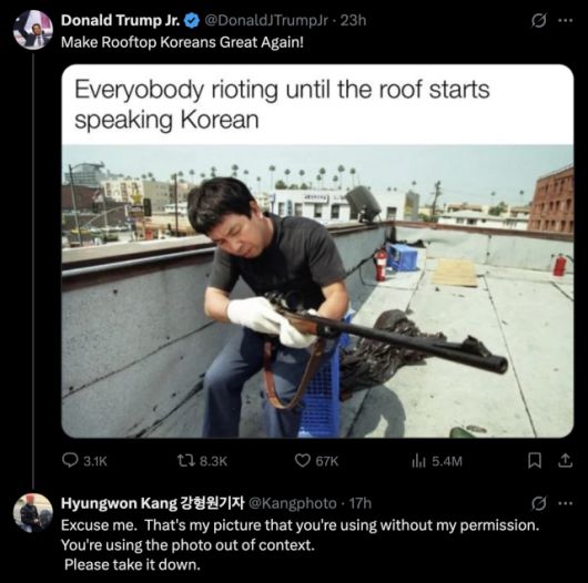 Hyungwon Kang, a former photo editor for the Los Angeles Times, said Trump Jr. posted one of his most recognizable photographs on social media without his permission with the caption, “Make Rooftop Koreans Great Again!”