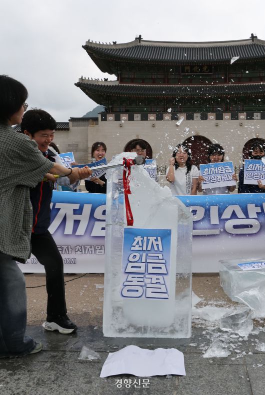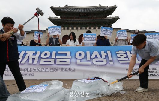 전국민주노동조합총연맹과 진보대학생넷 등이 10일 서울 종로구 광화문 월대에서 연 최저임금 확대 촉구하는 퍼포먼스를 하고 있다. 김창길 기자 |