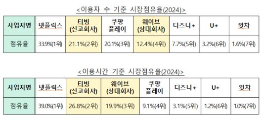 2024년 기준 OTT 시장 점유율을 보면, 이용자 수 기준으로 넷플릭스가 33.9%로 1위, 티빙이 21.1%로 2위, 쿠팡플레이가 20.1%로 3위, 웨이브가 12.4%로 4위를 차지한다. 이용시간 기준으로는 넷플릭스 39.0%, 티빙 26.8%, 웨이브 19.9% 순이다.