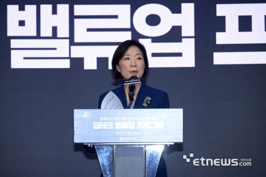 중소벤처기업부가 주최하는 글로벌 대기업과 유망 벤처 스타트업 협력기반 '딥테크 밸류업 프로그램' 행사에서 오영주 중소벤처기업부 장관이 인사말을 하고 있다. 김민수기자 mskim@etnews.com |