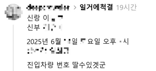 신고된 게시글은 스레드 내 ‘일거에 척결’이라는 이름의 카테고리에 올라왔다. 작성자는 이 대통령 아들의 결혼식 장소로 알려진 서울 성북구의 한 야외 예식장의 지도 사진과 함께 예식 일시를 공개하며 “진입 차량 번호를 딸 수 있겠다”고 언급했다. 해당 게시글은 10일 오후 12시 20분께 비공개로 전환됐다.