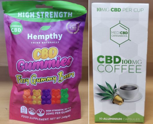 대마의 주요 성분인 칸나비디올(CBD)이 포함된 영국산 젤리(왼쪽)와 유럽연합산 커피. 식약처 제공 |