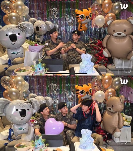 이날 라이브 방송에는 ‘맏형’ 진이 깜짝 등했다. 머리에 빨간색 리본을 단 상태로 등장한 진은 “전역 축하한다”면서 “내가 선물이다”라고 말해 한바탕 웃음을 자아냈다.
