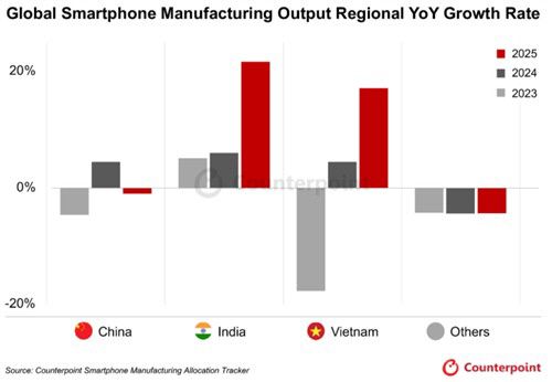 카운터포인트리서치는 중국과 가까우면서도 제조 및 수출 역량을 보유한 베트남과 성장 잠재력을 가진 인도의 생산량이 증가할 것으로 내다봤다. 특히 인도는 애플과 삼성의 수출 수요에 힘입어 올해 두 자릿수 성장률을 기록하며 글로벌 생산량의 20%를 차지할 것으로 예상했다.