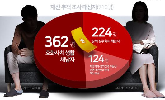 이번 재산 추적 조사 대상자는 △강제 징수를 회피한 체납자 224명 △차명계좌·명의신탁 부동산·은행 대여금고 등에 재산을 숨긴 124명 △호화사치 생활한 체납자 362명 등 모두 710명이다. 이들의 체납 규모는 모두 1조원으로 1인 최대 체납액은 수백억원에 달한다.