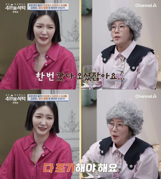 이에 김영희는 "한 번 갔다 오셨으니까 다 포기해야 한다. 다 내려놓은 상태에서 결혼 말고 연애하셨으면 좋겠다. 조건 생각하지 말고 연애해라"라고 조언했다.