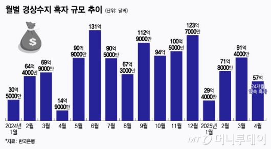 10일 한은이 발표한 '2025년 4월 국제수지(잠정)'에 따르면 4월 경상수지는 57억달러 흑자를 기록했다. 전월(91억4000만달러) 대비 흑자 폭은 줄었다. 다만 4월 기준으로는 역대 3번째로 큰 규모다.