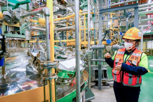 형광 작업복을 입은 중앙운전실 직원 눈은 모니터에서 벗어나지 않았다. 눈이 아플 만한데도 세밀하게 공정을 들여다보고 있었다. 원료 물류 이동과 탱크 레벨 관리, 용액 흐름 등 10개 라인과 20개 반응기를 모니터링한다.