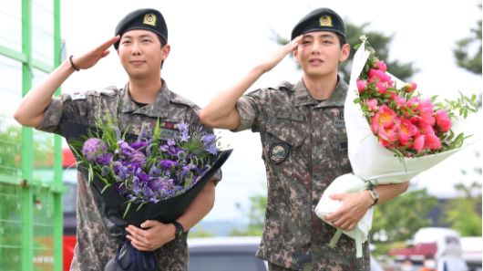 RM과 뷔는 10일 각 부대에서 퇴소한 뒤 강원 춘천시 신북읍체육공원 축구장에서 전역 인사를 전했다. RM과 뷔는 2023년 12월 육군 현역으로 입대했다. 이들은 각각 15사단 군악대와 2군단 군사경찰 특수임무대에서 복무했다.