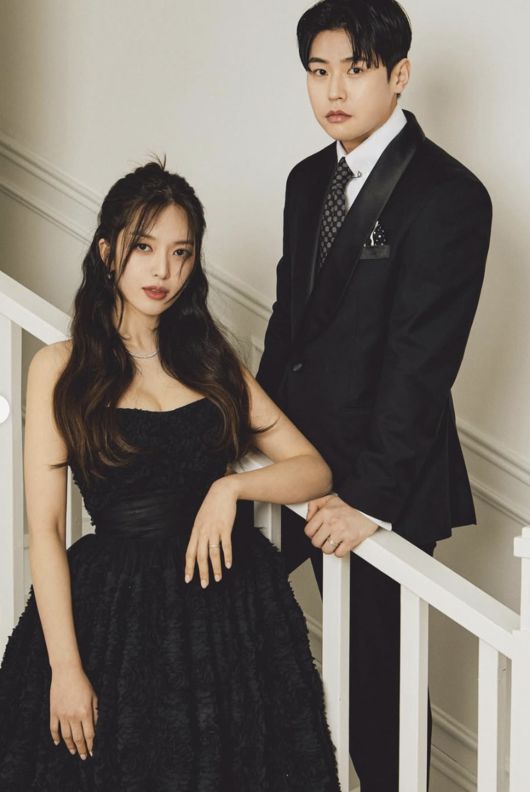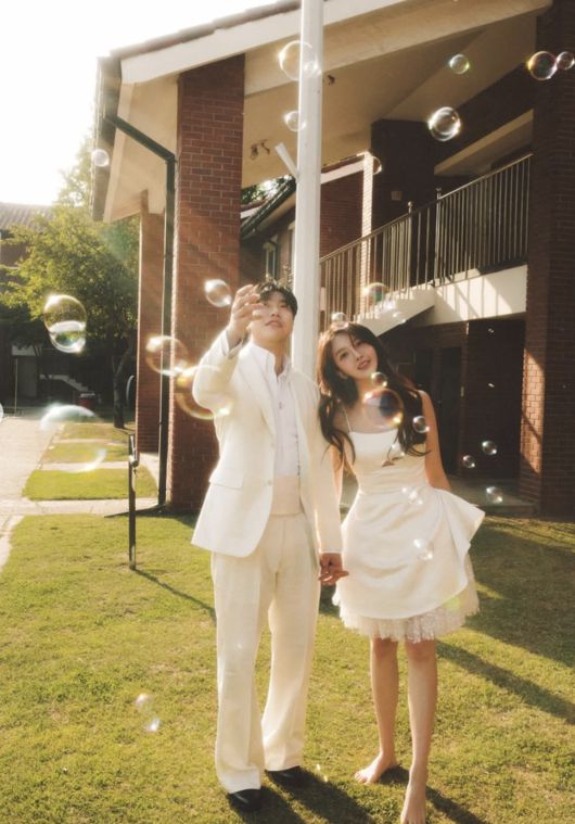 또한 마지막에는 오프숄더 웨딩드레스를 입은 정중한 화이트 톤의 정면 커플샷과 솔로 컷도 담겨, 공식 웨딩사진 느낌도 전했다.