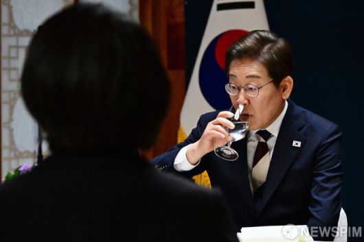 [서울=뉴스핌] 국회사진기자단 = 이재명 대통령이 4일 오후 서울 여의도 국회 사랑재에서 열린 제21대 대통령 취임 기념 오찬에 참석해 물을 마시고 있다. 2025.06.04 photo@newspim.com |