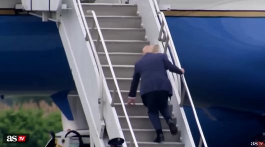 트럼프 대통령이 소속된 미국 공화당은 지난 2021년 3월 당시 79세였던 조 바이든 대통령도 전용기 탑승을 위해 같은 계단을 오르다 휘청거리자 그의 나이를 문제 삼으며 대통령직을 수행할 수 있을지 의심된다며 자주 공격했다.