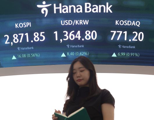 코스피가 전장보다 16.08p(0.56%) 오른 2,871.85로 마감한 10일 오후 서울 중구 하나은행 딜링룸에서 딜러들이 업무를 보고 있다. /연합뉴스 |