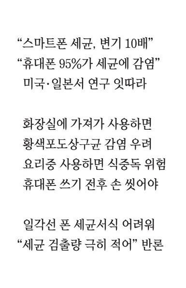 최근 들어 휴대전화(스마트폰)를 '세균의 온상'이라고 지적하는 연구 결과를 놓고 논란이다. 많은 사람이 휴대전화를 몸의 일부처럼 부엌에 가든, 화장실에 가든, 목욕탕에 가든, 식당에 가든 시간과 장소에 관계없이 가지고 다닌다. 그래서 휴대전화는 각종 세균이 달라붙고 감염병을 전파하기 쉬운 물건 중 하나가 됐다.