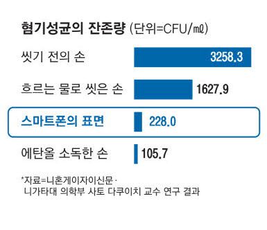 니혼게이자이신문은 미국 애리조나대 연구 결과를 인용해 "휴대전화에는 변기의 10배에 달하는 잡균이 있다"고 지적했다. 이어 "사우디아라비아 킹압둘아지즈대학 연구에서 의대생 휴대전화 중 95% 이상이 세균에 오염됐으며 전체의 약 20%에서 식중독이나 폐렴의 발병 원인이 되는 황색포도상구균이 검출됐다"고 밝혔다. 황색포도상구균은 우리 몸에 상존하는 상재균(常在菌)으로 건강한 사람도 비강, 인·후두, 피부, 털에 서식하는 균이다. 그러나 이 균은 면역력이 떨어지면 감염돼 연부 조직 감염(봉와직염, 화농성 근육염), 화농성 관절염, 화농성 골수염, 중이염, 폐렴, 수술 후 창상 감염, 균혈증, 심내막염, 식중독 등을 일으키는 원인균이다.