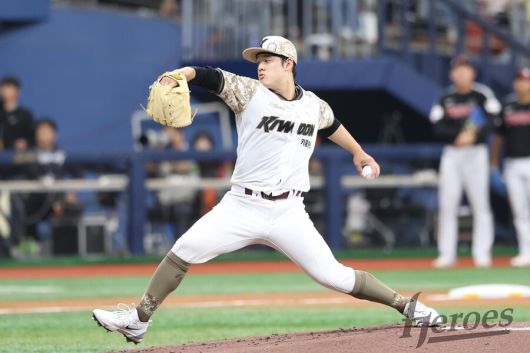 키움 히어로즈 선발 투수 정현우가 8일 서울 고척스카이돔에서 열린 2025 KBO리그 엘지 트위스와 경기에서 역투를 펼치고 있다. 키움 히어로즈 제공 |