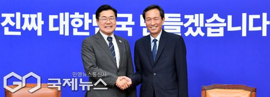 (서울=국제뉴스) 박찬대 더불어민주당 당대표 직무대행 겸 원내대표가 10일 서울 여의도 국회에서 우상호 대통령실 정무수석을 접견하며 악수하고 있다./사진=이용우 기자