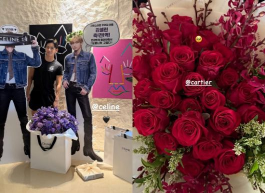 셀린느는 '자랑스러운 우리집 아들 김셀린 축!전!역! 건강하게 돌아와 줘서! 눈물 나게 고맙다!', '보라해'라는 문구가 적힌 판넬과 함께 보라색 꽃 등의 선물을 보냈다.