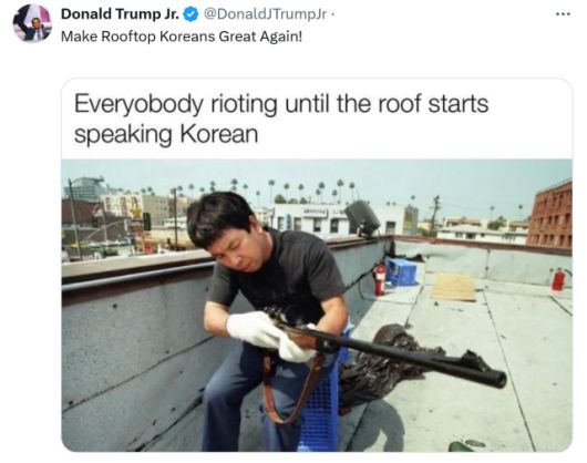 트럼프 대통령의 장남인 도널드 트럼프 주니어는 전날 X 등에 과거 LA 폭동 당시 현장을 담은 사진을 올리고 “루프톱 코리안을 다시 위대하게(Make Rooftop Koreans Great Again!)”라고 썼다. 이를 두고 무법 상태였던 33년 전의 LA 폭동과 이번 시위를 연결해 트럼프 행정부의 강경 대응을 정당화하려는 포석이라는 해석이 나온다.