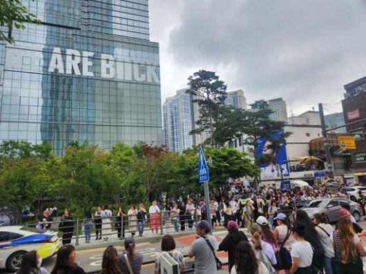 경찰 추산 약 1500명의 팬들이 하이브 사옥 주변에 모여 방탄소년단 RM과 뷔의 전역을 축하했다. 하이브 |