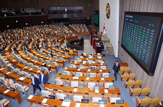 5일 오후 서울 여의도 국회 본회의에서 검사징계법 일부개정법률안 상정에 반발하며 국민의힘 의원들이 퇴장하면서 국민의힘 의원 자리가 비어 있다. [사진출처=뉴스1] |