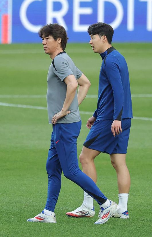 대한민국 축구 국가대표팀 홍명보 감독과 손흥민이 쿠웨이트와의 2026 북중미 월드컵 아시아 3차 예선 최종전을 하루 앞둔 9일 서울월드컵경기장에서 훈련 중 대화를 나누고 있다. [사진=연합뉴스] |