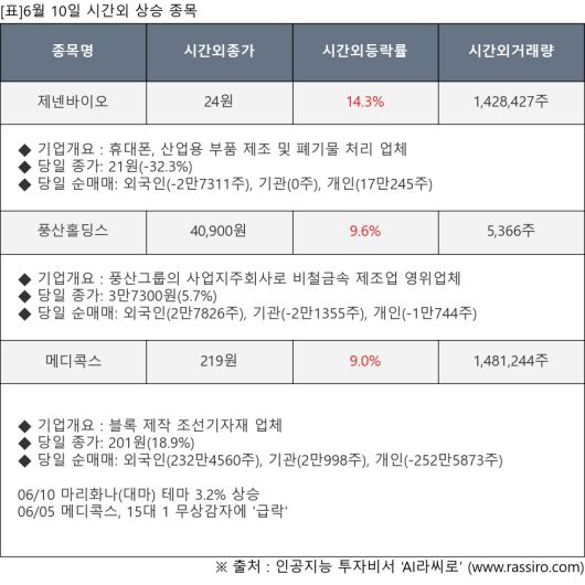 [서울=뉴스핌] 로보뉴스 = 6월 10일, 인공지능 투자비서 ‘AI라씨로’는 시간외 단일가 매매에서 주가가 크게 변동한 제넨바이오(072520), 풍산홀딩스(005810) 등의 최근 동향을 분석해서 발표했다.