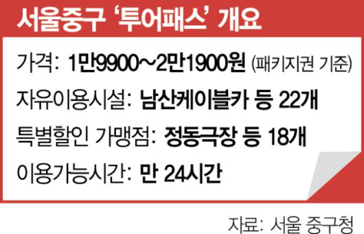 10일 관련 지자체에 따르면 서울 중구는 지난달 23일 외국인 관광객용 서울 중구 투어패스를 내놓았다. 기존 중구 투어패스는 발권 후 24시간 동안 사용 가능하며 남산케이블카, 테테루뮤지엄, 헤이티 등 3곳을 제외한 37곳에 사용가능한 기본권(9900원)과 40곳에 사용가능한 패키지권(1만9900~2만1900원)으로 구성됐다.