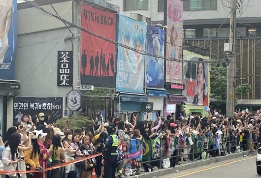 사옥 앞 도로에는 멤버들의 전역을 축하하는 문구와 사진이 담긴 전광판을 실은 트럭이 가득했다. 인근 카페 등도 멤버들의 얼굴이 담긴 현수막으로 건물 외벽을 장식했다. 거리에는 전광판에서 흘러나오는 방탄소년단의 노래가 울려퍼졌고 팬들은 전광판과 현수막을 배경으로 인증사진을 찍었다. 방탄소년단 상징색인 보라색으로 옷을 맞춰입은 팬들이 일대를 가득 메우면서 거리 또한 보랏빛으로 가득 찼다.