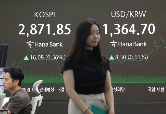코스피가 전장보다 16.08 오른 2871.85로 마감한 10일 오후 서울 중구 하나은행 딜링룸에서 딜러들이 업무를 보고 있다. 연합뉴스 |