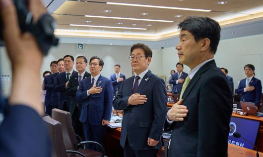 이재명 대통령이 10일 오전 서울 용산 대통령실에서 열린 국무회의에서 국민의례를 하고 있다. 대통령실 제공 |