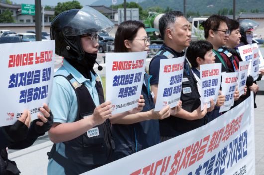 [서울=뉴스핌] 이길동기자= 민주노총 전국서비스산업노동조합연맹 배달플랫폼 노동조합원들이 9일 서울 종로구 정부서울청사 앞에서 배달노동자 최저임금 확대 적용 촉구를 위한 기자회견을 하고 있다. 2025.06.09. gdlee@newspim.com |
