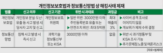 개인정보보호법의 경우는 개인정보 분실·도난·유출 등 사고가 발생했을 경우 72시간 내에 당사자에게 고지하고, 개인정보보호위원회에도 신고하도록 규정한다. 다만 이는 사이버 공격 사태 조사로 이어지지는 않고, 개보위에서 제재 수위만 결정해 통보하는 절차로 이어진다.