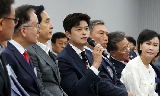 국민의힘 김용태 비상대책위원장(가운데)이 10일 서울 여의도 당사에서 열린 원외 당협위원장 간담회에서 발언하고 있다. 뉴시스 |